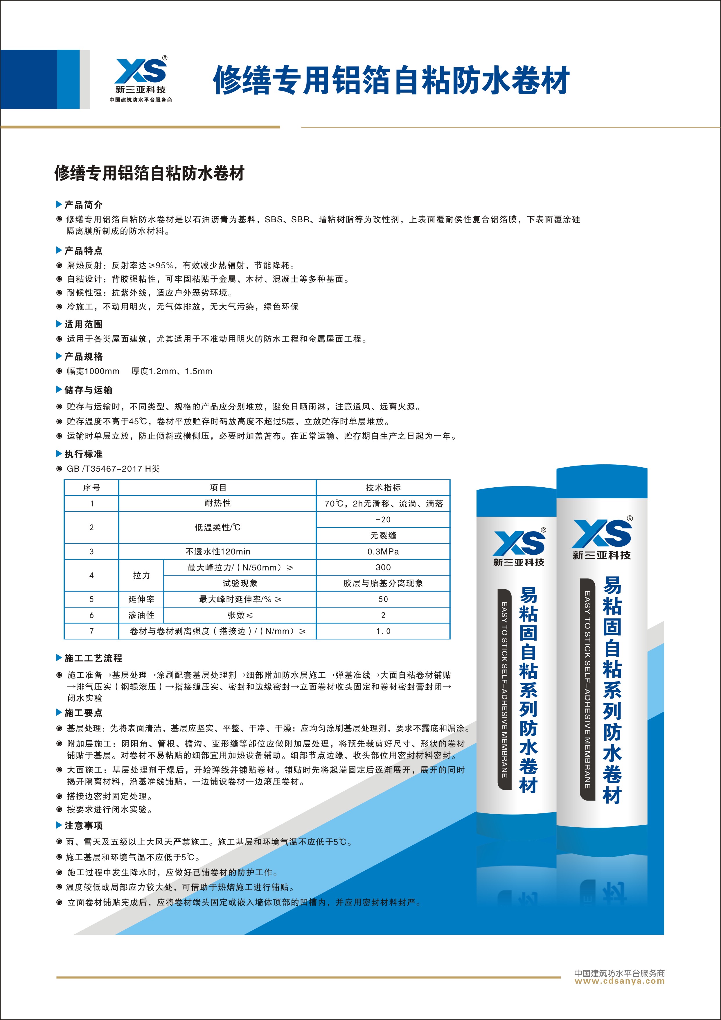 產(chǎn)品簡(jiǎn)介 修繕專用鋁箔自粘防水卷材以石油瀝青為基料,SBS、SBR、增粘樹(shù)脂等為改性劑,上表面覆耐侯性復(fù)合鋁箔膜,下表面覆涂硅隔離膜所制成的防水材料。 規(guī)格:1.2mm 1m×20 m | ![]() |