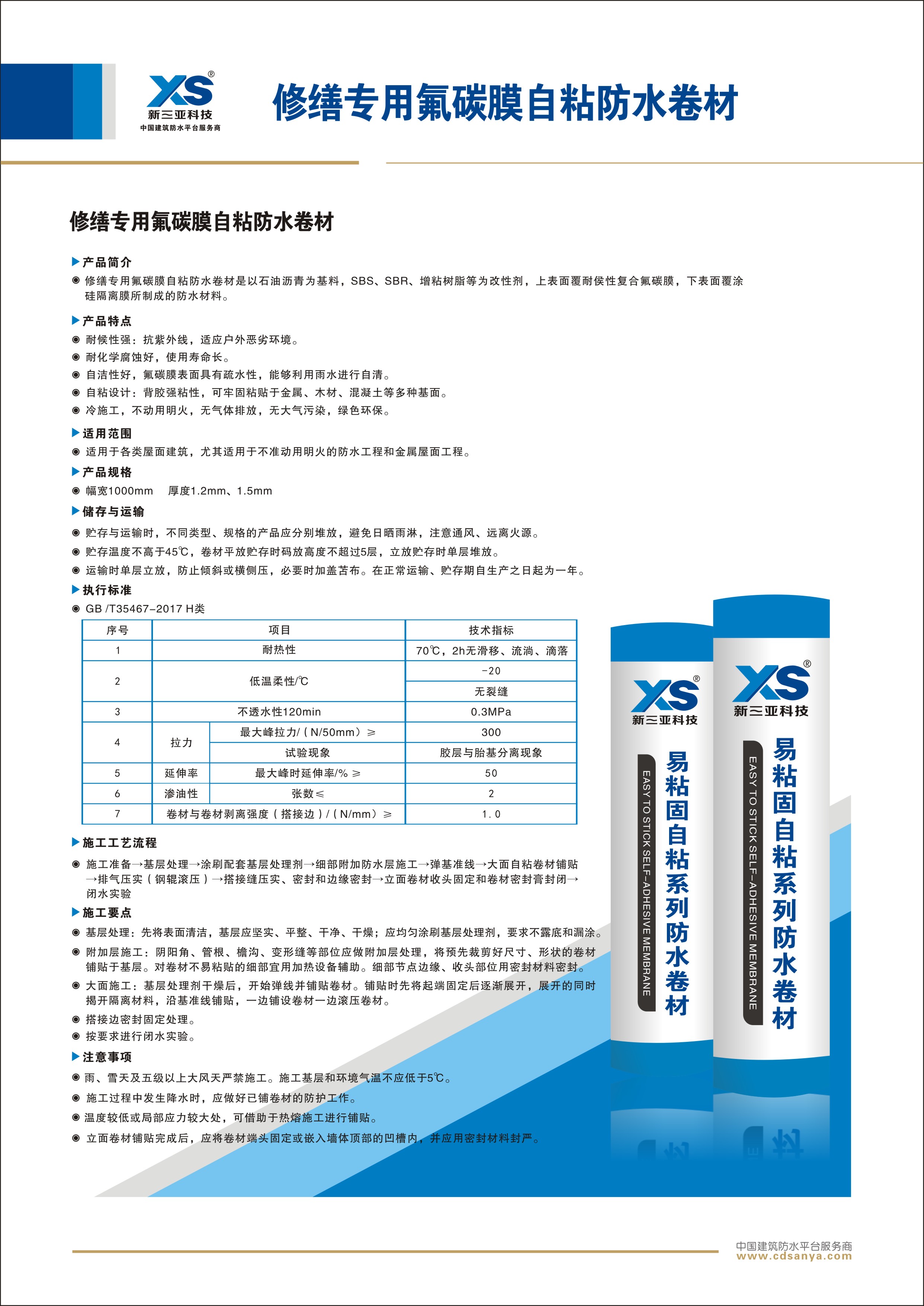 產(chǎn)品簡介: 以石油瀝青為基料,SBS、SBR、增粘樹脂等為改性劑,上表面覆耐侯性復(fù)合氟碳膜,下表面覆涂硅隔離膜所制成的防水材料。 規(guī)格:1.5 mm 厚度*寬度*長度 1.5mm 1m×20m 面膜顏色 白色 | ![]() |