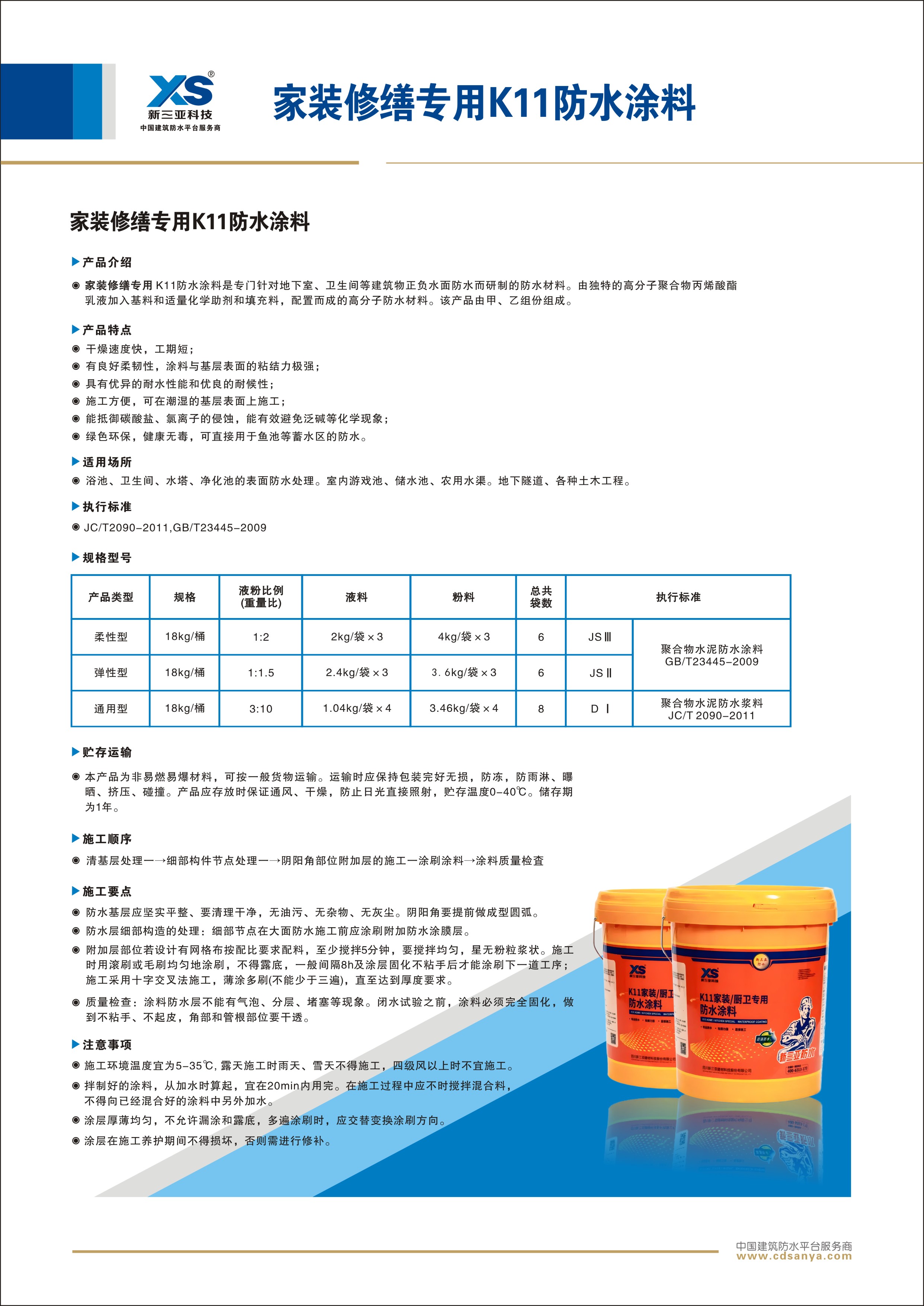 家裝修繕專用K11防水涂料是專門針對(duì)地下室、衛(wèi)生間等建筑物正負(fù)水面防水而研制的防水材料。由獨(dú)特的高分子聚合物丙烯酸酯乳液加入基料和適量化學(xué)助劑和填充料,配置而成的高分子防水材料。該產(chǎn)品由甲、乙組份組成。