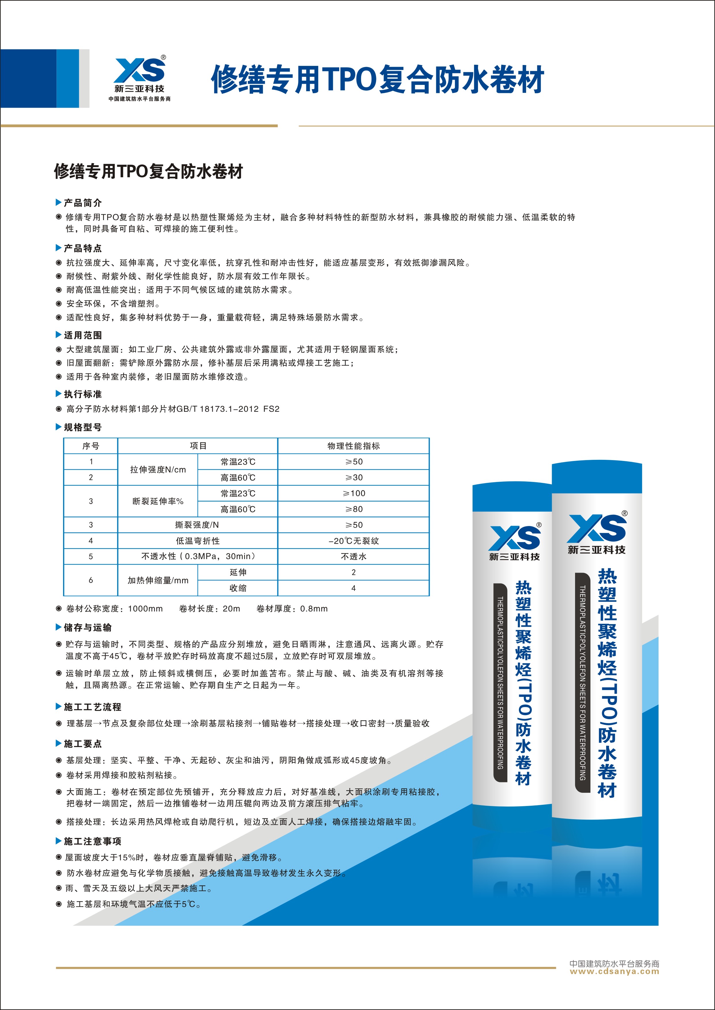 產(chǎn)品簡(jiǎn)介: 修繕專用TPO復(fù)合防水卷材是以熱塑性聚烯烴為主材,融合多種材料特性的新型防水材料,兼具橡膠的耐候能力強(qiáng)、低溫柔軟的特性,同時(shí)具備可自粘、可焊接的施工便利性。 規(guī)格:FS2-TPO-20.0m×1.15m×0.8mm | ![]() |