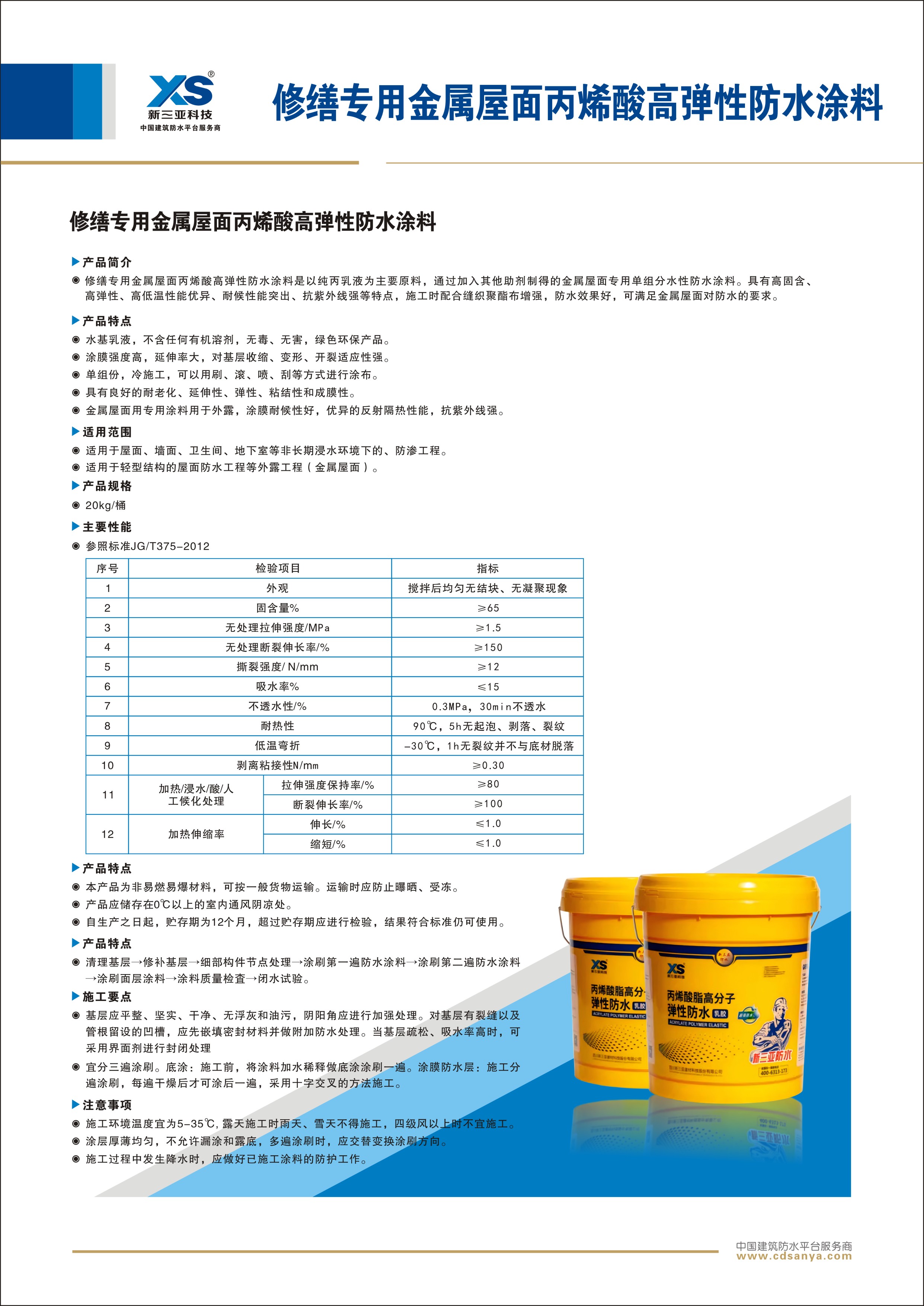 修繕專用金屬屋面丙烯酸高彈性防水涂料是以純丙乳液為主要原料,通過(guò)加入其他助劑制得的金屬結(jié)構(gòu)專用單組分水性防水涂料。具有高固含、高彈性、高低溫性能優(yōu)異、耐候性能突出、抗紫外線強(qiáng)等特點(diǎn),施工時(shí)配合縫織聚酯布增強(qiáng),防水效果好,可滿足金屬屋面對(duì)防水的要求。